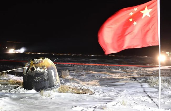 取样工作完成后,着陆器上的上升器起飞,携带2千克月球物质样品,发射回绕月轨道。在绕月轨道上,轨道器将封装好的样品回收,返回地球,以极高的速度重新进入地球大气层,降落内蒙古。至此,为期大约23天的航天探月取样任务完美收官。