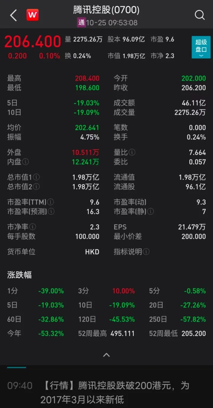 在股价方面,昨日(10月24日)港股恒指低开1.95%,收跌6.36%,报15180.69点。腾讯股价跳空低开,盘中最低下探至211.6港元。昨日港股收盘,腾讯收跌11.43%,录得206.2港元。
