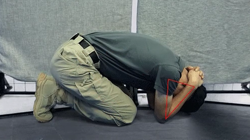 我们还要把握机会靠近墙壁,寻找机会将身体从侧卧调整为跪卧,双手扣紧后脑,同时,我们要将脚腕部、小腿与大腿、大腿与躯干、躯干与大臂、大臂与小臂,均调整为三角形支撑身体,可以更加有效地提高我们的抗压性。