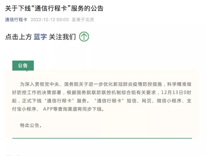 为深入贯彻党中央、国务院关于进一步优化新冠肺炎疫情防控措施,科学精准做好防控工作的决策部署,根据国务院联防联控机制综合组有关要求,12月13日0时起,正式下线“通信行程卡”服务。“通信行程卡”短信、网页、微信小程序、支付宝小程序、 APP等查询渠道将同步下线。