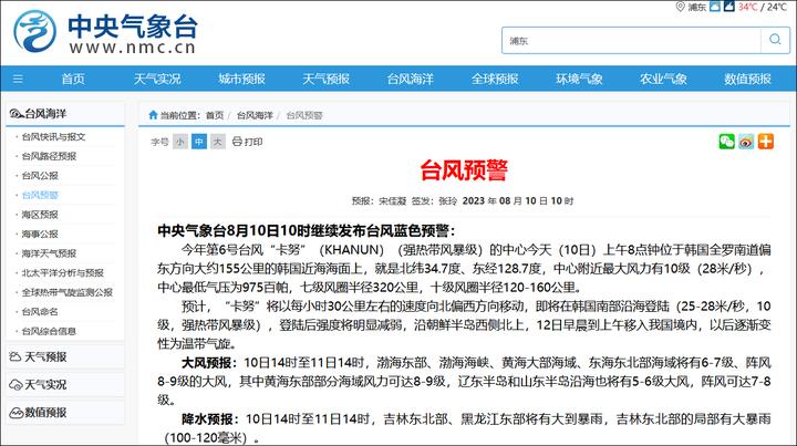 中央气象台10日10时继续发布台风蓝色预警。预警称,预计“卡努”将于12日早晨到上午移入我国境内,以后逐渐变性为温带气旋。10日14时至11日14时,渤海东部、渤海海峡、黄海大部海域、东海东北部海域将有6-7级、阵风8-9级的大风,其中黄海东部部分海域风力可达8-9级,辽东半岛和山东半岛沿海也将有5-6级大风,阵风可达7-8级。10日14时至11日14时,吉林东北部、黑龙江东部将有大到暴雨,吉林东北部的局部有大暴雨(100-120毫米)。